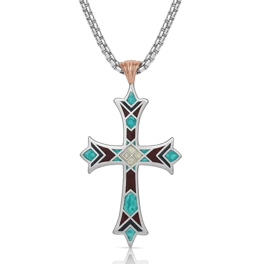 Embracing all the colors in this cross, the American Legends Embracing Faith Cross necklace is inspired by the different colors our faith journey follows. Is is a cross shape with floral-edges that scallop out for flare. It is outlined in silver finished edge entails coral, mother of pearl, onyx and turquoise inlay. This necklace has a 23 inch delicate chain to dangle from your neck.