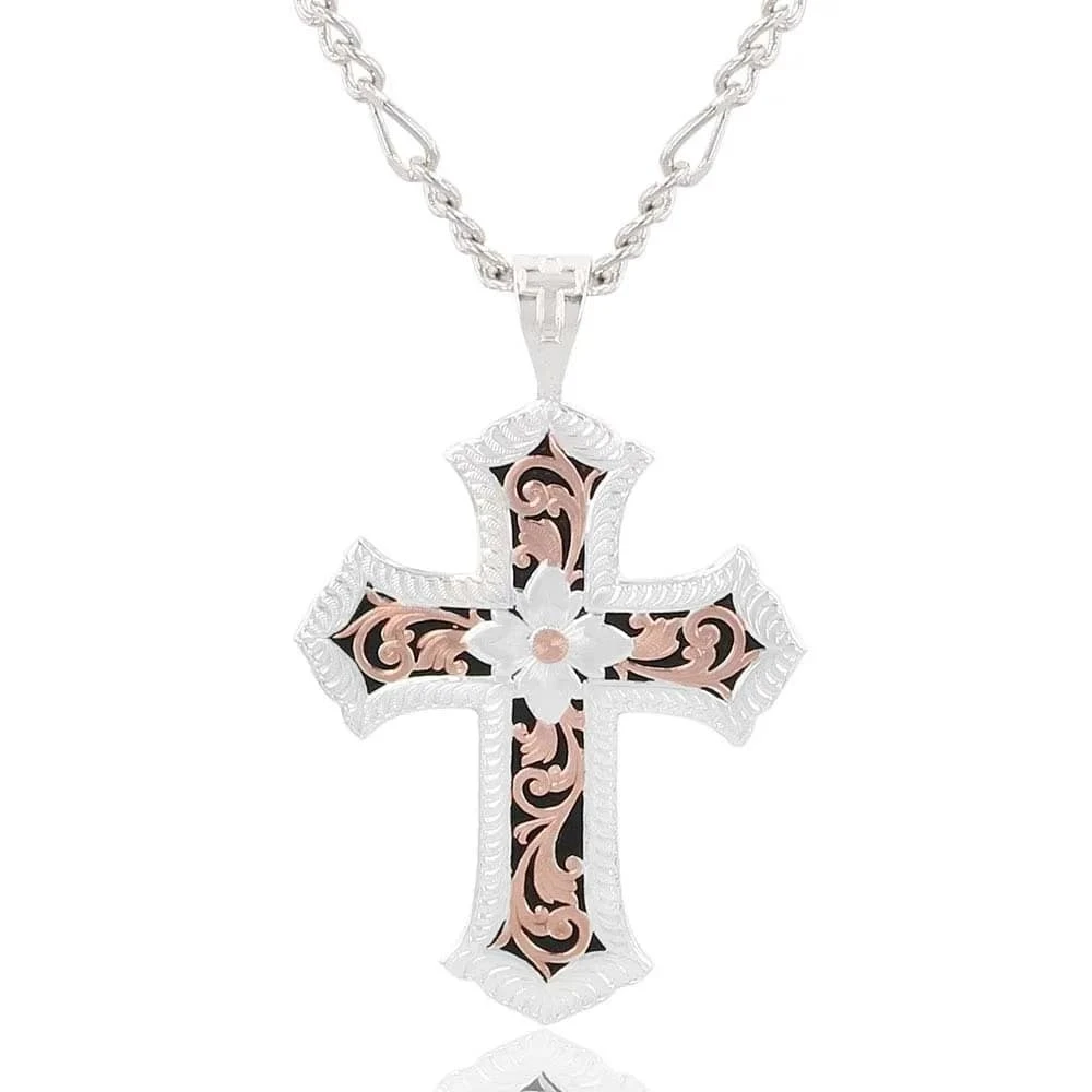 The stunning filigree on this antiqued silver and rose gold finish cross is sure to draw many compliments. The center fleurette and etched edging in silver filled with scrolling leafy pattern through each arm in rose gold is graceful and pretty, popping against a hand antiqued background that highlights its symmetrical beauty. This necklace is destined to be a favorite for men and women. The pendant hangs on a matinee length 22 inch Figaro chain.