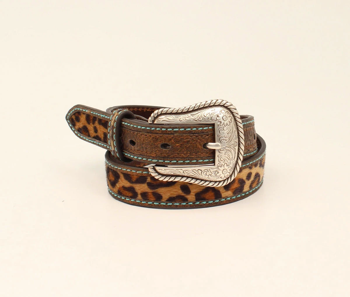 Your little one will love to wear this grown up looking Ariat belt by M&F Western Products. This fashionable leopard print strap has turquoise accent stitching on the edges. This adorable belt will certainly be your little cowgirls favorite.