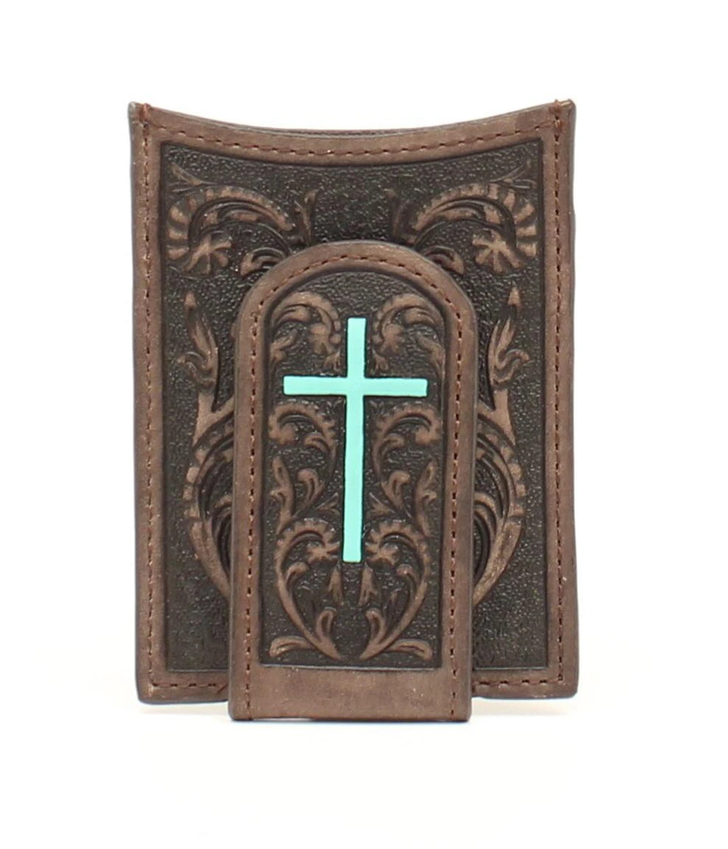 This leather AriatTM money clip wallet by M&F Western Products® features a handsome embossed pattern with a thin turquoise Cross.