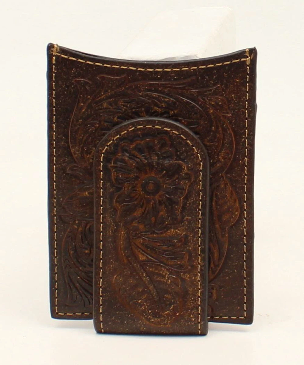 This leather AriatTM money clip wallet by M&F Western Products® features a beautiful western floral embossed pattern. Inside consists of credit card slots, money slots, and a place for your ID.