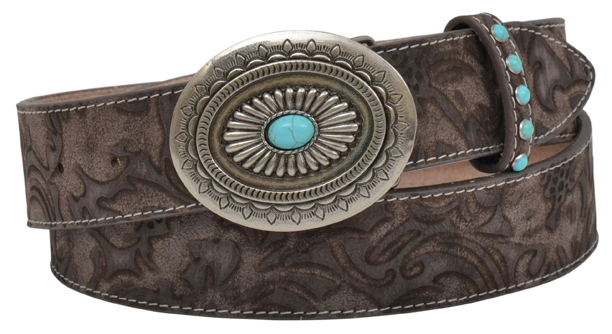 Women’s Angel Ranch Tan Floral Belt with Silver Buckle. Brown genuine leather belt with embossed floral print. Single-row contrast stitching. Removable antique silver tone buckle with turquoise colored marble accent stone and turquoise colored stones on keeper. Measures: 1 1/2″ wide.