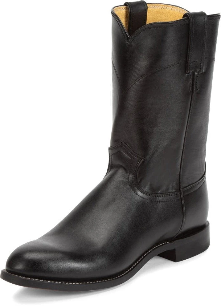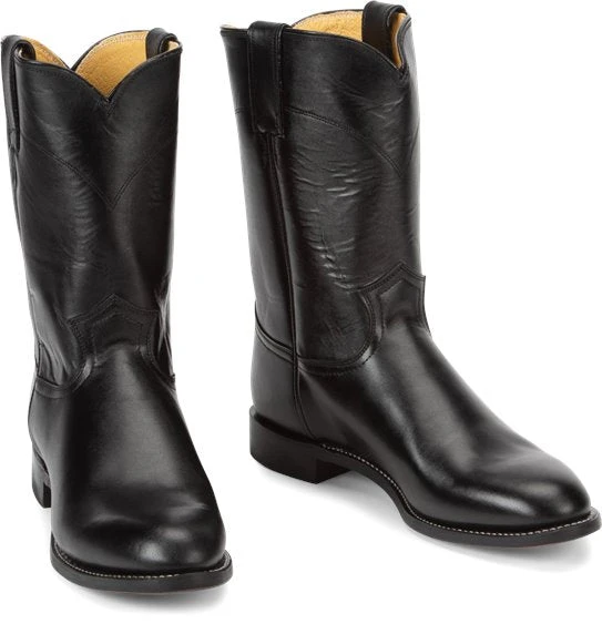 An understated classic, the Jackson Black 10″ tall Men’s roper boot is a simple black boot with a traditional silhouette. The quality leather exterior glistens with the sheen of luxury and its round toe and unit heel provide a relaxed fit in and out of the stirrup. The J-Flex Flexible Comfort System® insoles keep things comfortable with leather-covered cushioned insole and triple density insole board.
