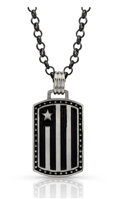 In the Pursue the Wild Collection a rectangle style pendant has an iconic stylized design of the American Flag with the stripes flowing downwards, the flag design is surrounded by a border of pinpoints. The design is emphasized by the paint placed in lower profiles of the pendant. The back of the pendant has a brushed satin looking finish with the words “Freedom Isn’t Free” engraved in the center. Pendant hangs on a bail that looks like three melded rings on a 28 inch length chain, with stations at 24, 26 and 28.