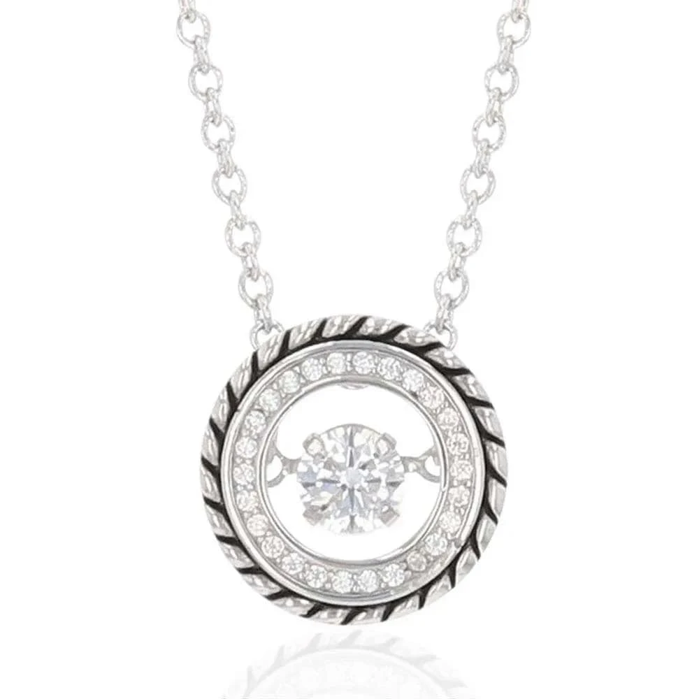 A dancing stone circle necklace pendant to add extra sparkle to your life. A brilliant round stone shimmers with movement held by two delicate arms in the center of a ring of bright clear stones with an outer edge of antiqued silver tone rope design. A princess length, 19 inch chain threads through a back loop.