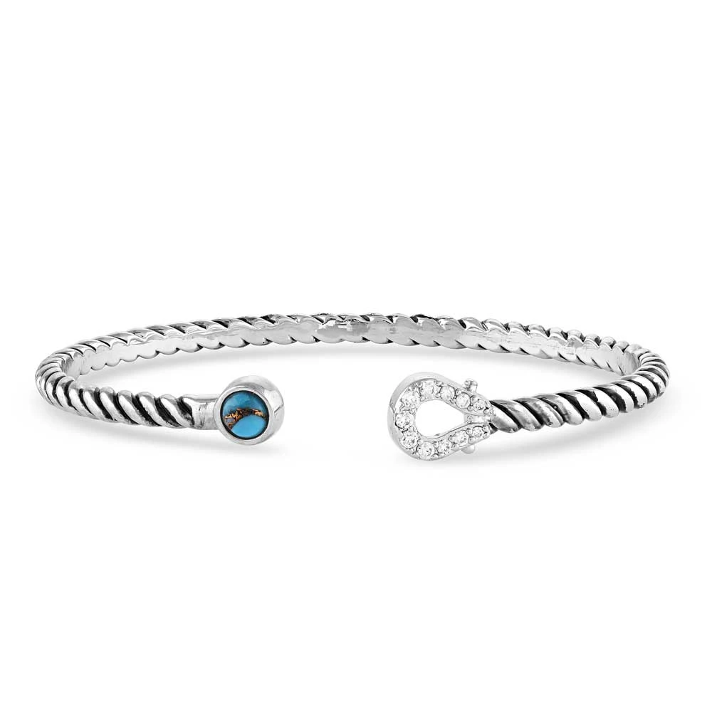 Never run out of luck again with the Infinite Luck Turquoise Cuff Bracelet! This lovely reverse silver cuff bracelet wraps around your wrist with a beautiful antiqued twisted rope to open on one side with a gorgeous turquoise and copper stone and on the opposite end a horseshoe adorned with clear crystals to make it sparkle. One size fits most. Stone color may vary.