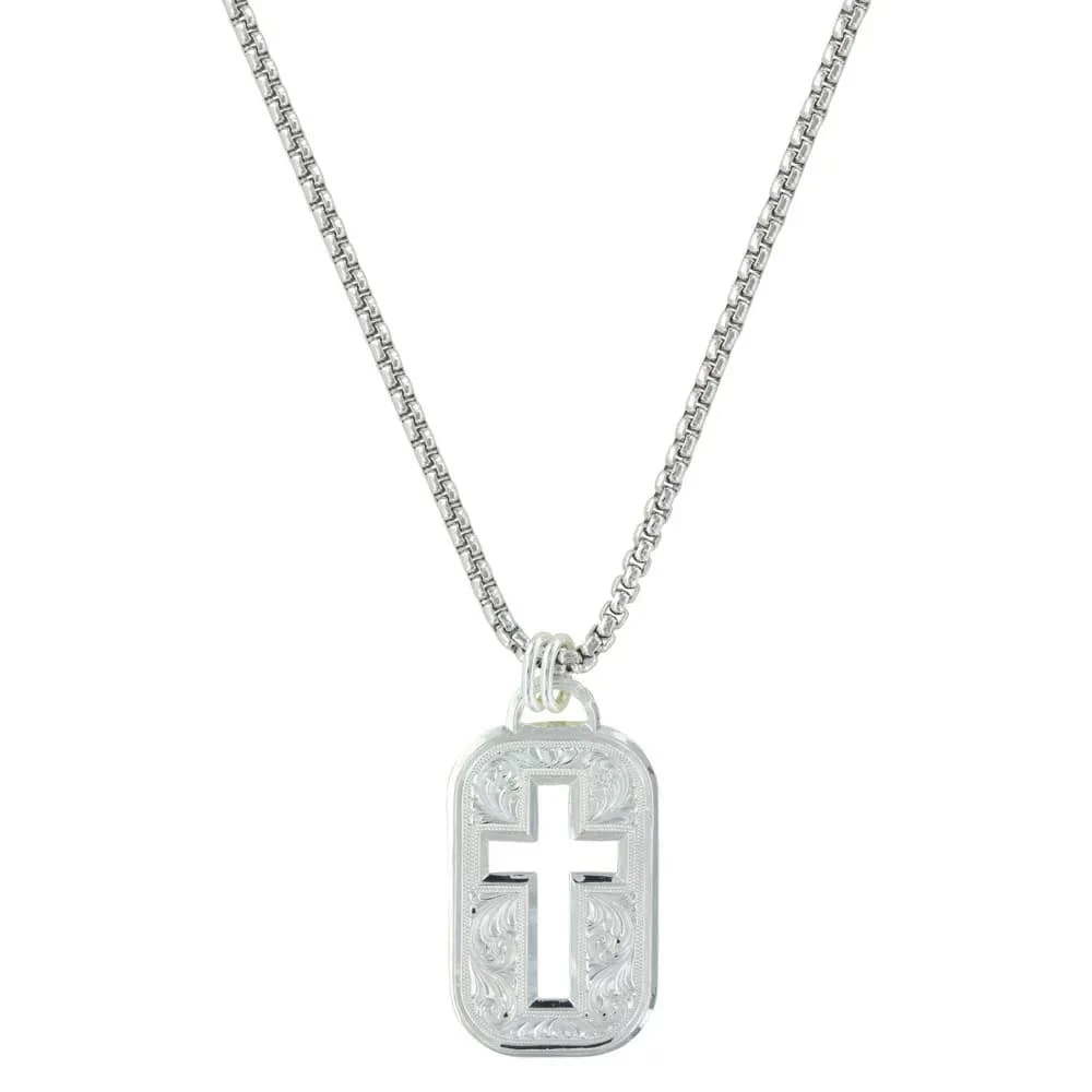 It might look like a dog tag, but this token necklace is anything but standard issue.?This rounded rectangle token has classic bright cut Western engraving design that flows around a sharply defined cross shape cut out. Pendant hangs off a double loop bail on a 23 inch box chain.