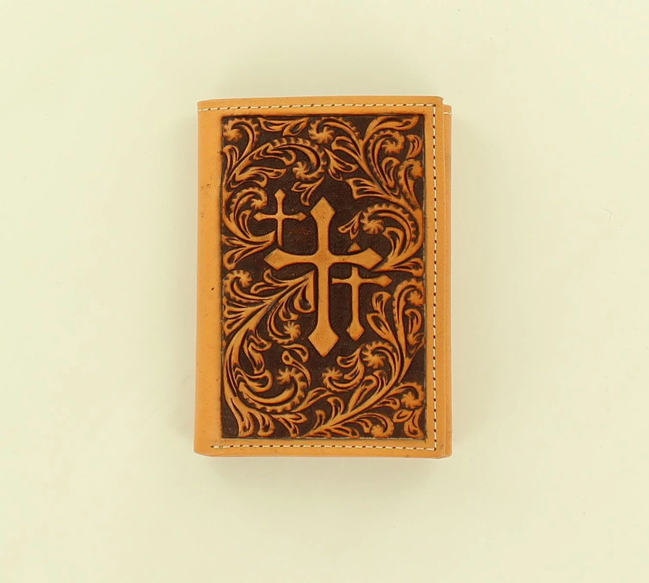 This Nocona trifold wallet by M&F Western Products® is a beautiful hand tooled with floral and triple cross accents and contrasting stitching. Inside features multiple compartments for your credit cards, cash, and an ID window.